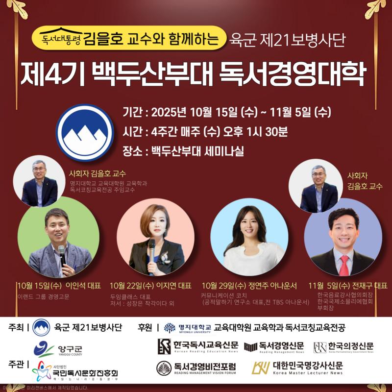 제4기 백두산부대 독서경영대학 강사진 홍보 포스터(사진 제공 = 이혜정 기자)