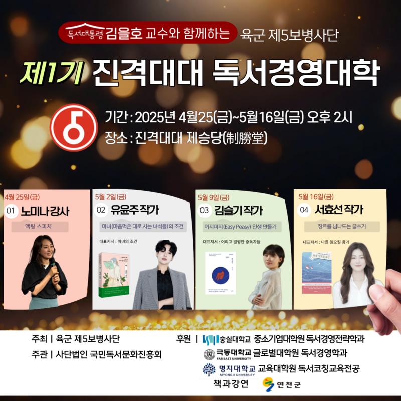 한편, 제5보병사단 독서경영대학은 김을호 교수(숭실대학교 중소기업대학원 독서경영전략학과 주임교수)의 기획 아래, 군 장병들에게 독서를 통해 사고력·표현력·자기경영 역량을 길러주는 강연 프로젝트다. 강사와 저자, 전문 코치들이 직접 군 현장을 찾아가 ‘책으로 성장하는 리더 만들기’에 앞장서고 있다.