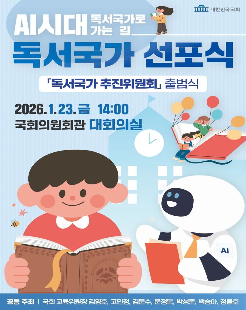 AI가 책을 요약하고 정보를 대신 읽어주는 시대가 되었지만, 대한민국은 오히려 ‘독서국가’를 선언한다. 2026년 1월 23일 오후 2시, 국회의원회관 대회의실에서 열리는 「독서국가 선포식: AI 시대, 독서국가로 가는 길」은 기술의 시대에 인간다움의 방향을 다시 묻는 자리다.