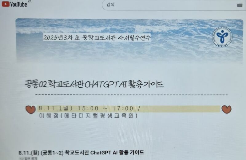 2025년 8월 11일, 서울시특별시교육청이 주최하고 교육지원청 11개 학교도서관지원센터가 함께한 「2025년 초·중학교 학교도서관 사서 필수연수 - 학교도서관 ChatGPT AI 활용 가이드」가 서울독서교육지원본부(창덕여중 내)에서 비대면 온라인 방식으로 열렸다. 이번 연수는 서울시내 초·중학교 교육공무직 사서 600여 명을 대상으로 진행되었다.