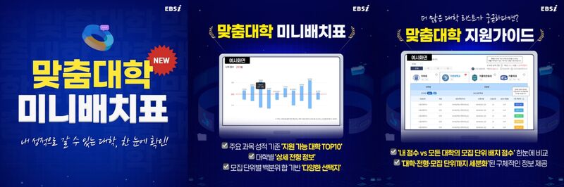 EBS(사장 김유열)는 수능을 마친 수험생들이 자신의 강점을 파악하고 효율적인 정시 전략을 수립할 수 있도록 11월 13일(목)부터 〈맞춤대학 미니배치표〉와 〈지원가이드〉 서비스를 본격 오픈했다고 밝혔다. 이번 서비스는 수험생이 성적을 입력하면 즉시 합격 가능성이 높은 대학 TOP10을 제시하는 ‘데이터 기반 맞춤형 진학 솔루션’이다.
