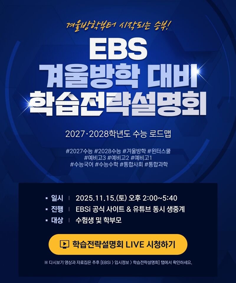 설명회는 별도의 신청 없이 무료로 시청 가능하며, 설명회 종료 후 ‘2027·2028학년도 입시 전략’ 자료집도 제공된다. EBS는 “겨울방학은 학습 습관이 바뀌는 결정적 시기인 만큼, 학생들이 스스로 학습을 설계할 수 있는 전략을 제시하겠다”고 전했다.