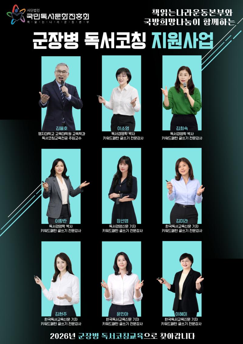 강사진은 (사)국민독서문화진흥회 책읽는나라운동본부 소속 지부장 및 분회장 가운데 ‘키워드글쓰기전문가 1급·2급’ 자격을 보유하고 군부대 강연 경험이 있는 전문 강사들로 1차 구성된다. 독서경영학 박사, 현장 언론인, 독서교육 전문 강사 등으로 이뤄진 강사진은 군 장병 눈높이에 맞춘 맞춤형 강연과 실습 중심 프로그램을 제공할 계획이다.